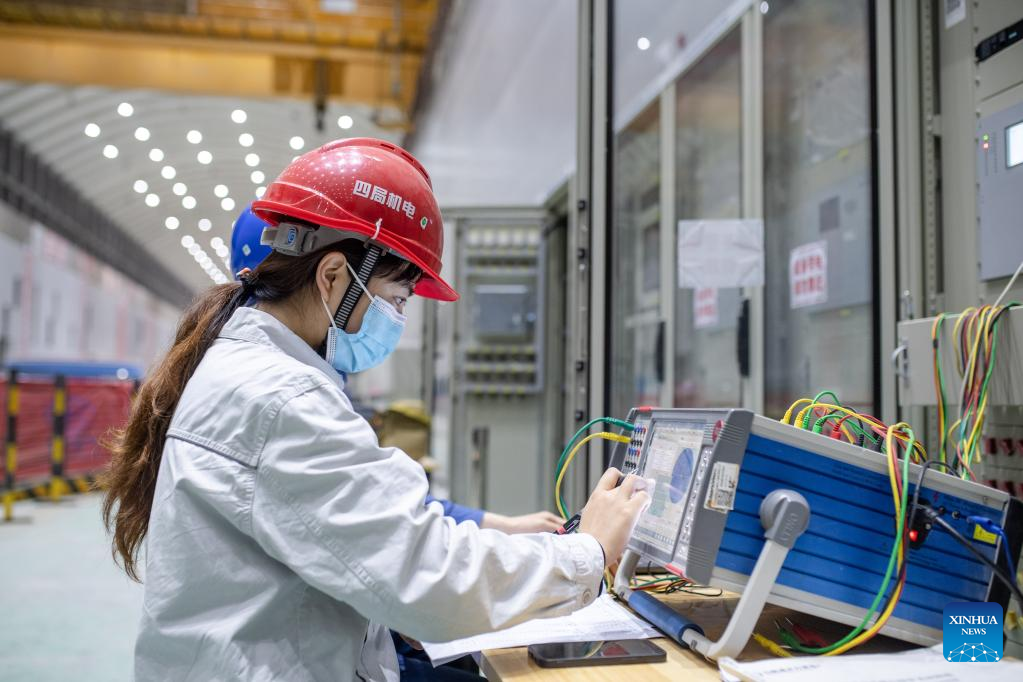 Technicians work at the underground workshop of the Baihetan hydropower station in southwest China, April 21, 2022. The Baihetan hydropower station, a major project in China's west-east power transmission program, is located on the Jinsha River, the upper section of the Yangtze River in southwest China.