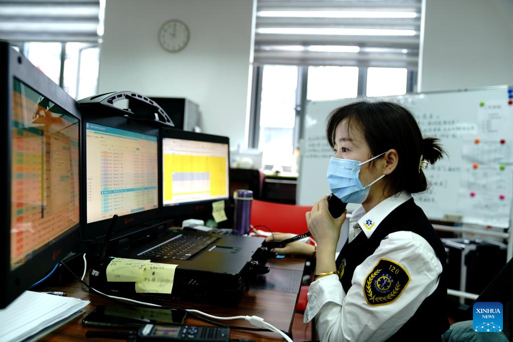 A staff member talks on the phone to dispatch ambulances at the medical emergency center of Minhang District of Shanghai, east China, April 23, 2022.