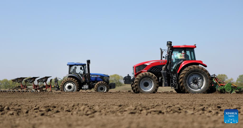 Tractors plough at a soybean farm in Shisijiazi Village of Daniu Township in Tai'an County, northeast China's Liaoning Province, April 22, 2022. (Xinhua/Yao Jianfeng)
