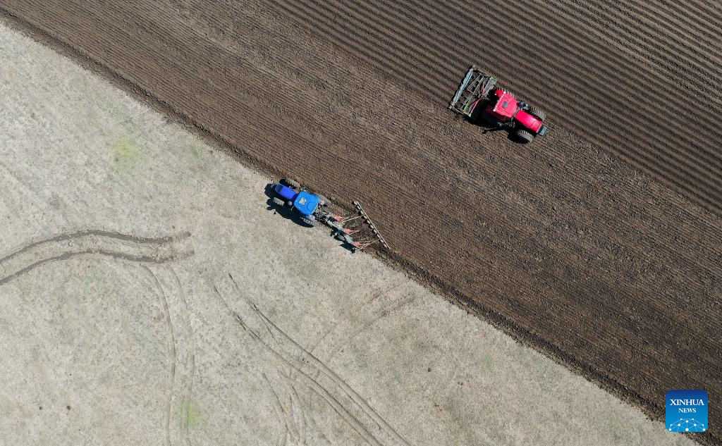 Aerial photo taken on April 22, 2022 shows tractors ploughing at a soybean farm in Shisijiazi Village of Daniu Township in Tai'an County, northeast China's Liaoning Province. (Photo by Liu Ming/Xinhua)