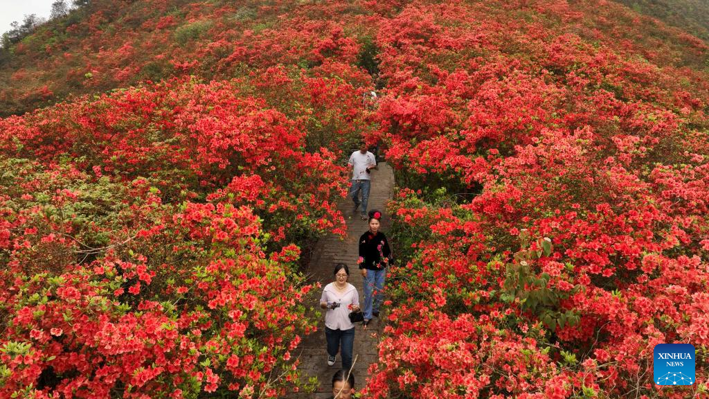 Aerial photo taken on April 23, 2022 shows tourists viewing blooming azalea flowers at Longquan Mountain in Danzhai County, southwest China's Guizhou Province. The sight of azalea flowers stretched across the mountain offers a spectacular view and is a gratifying reward for tourists who come here to enjoy the flowers while hiking. (Xinhua/Yang Ying)
