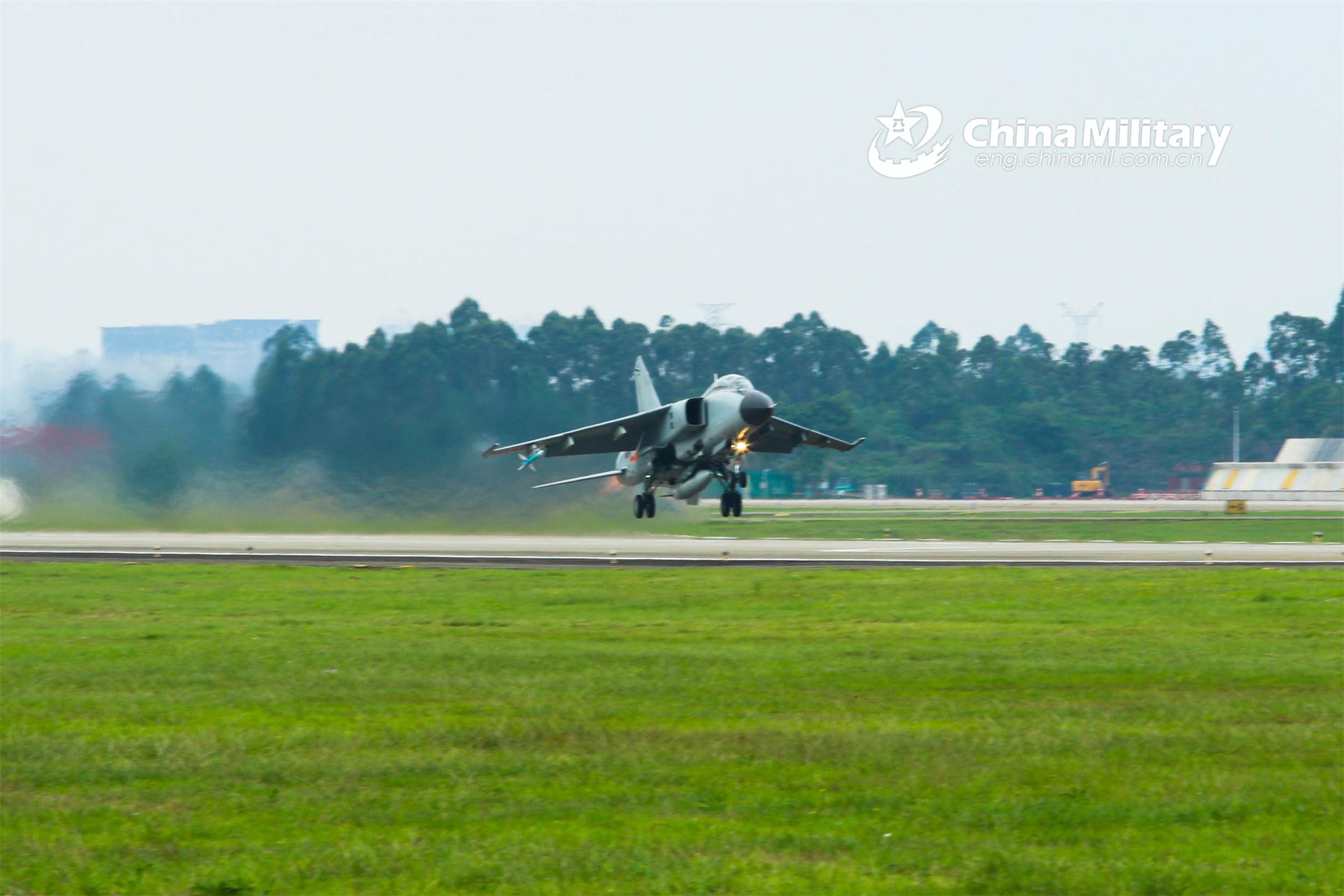 A fighter jet attached to an aviation brigade with the air force under the PLA Southern Theater Command takes off after rain for a flight training exercise on March 25, 2022. (eng.chinamil.com.cn/Photo by Xu Jingcheng)