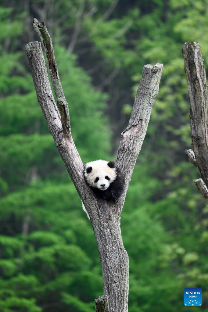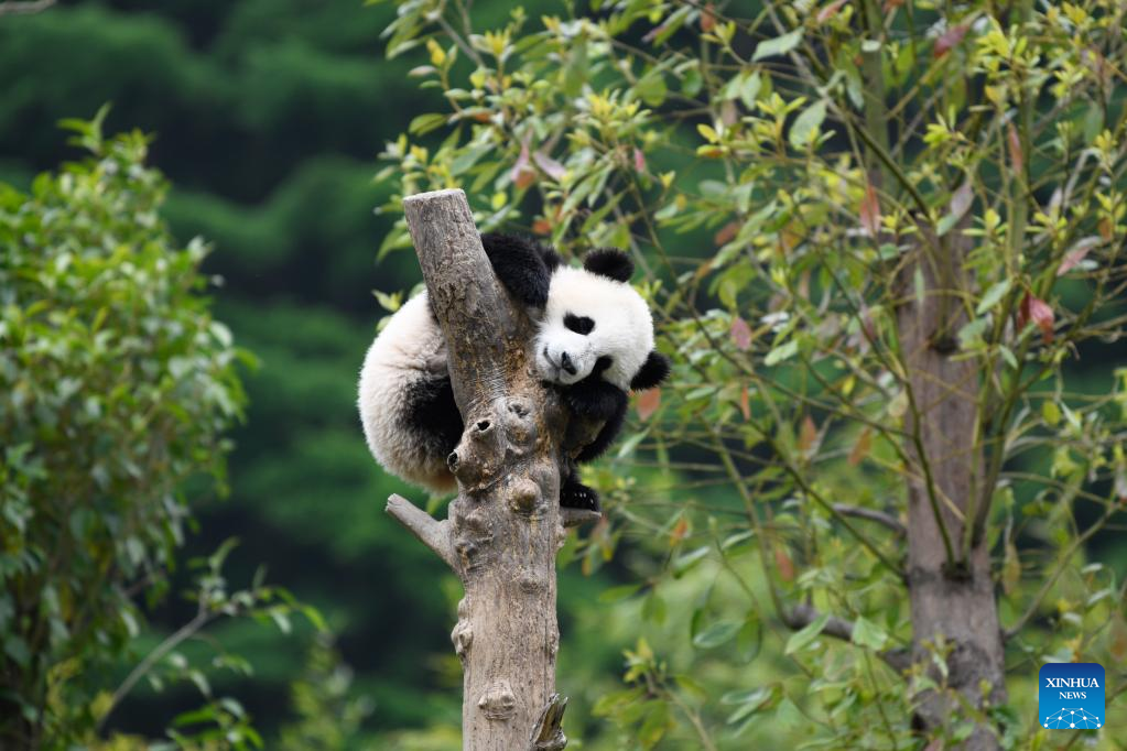 A giant panda climbs a tree at Shenshuping base of China Conservation and Research Center for Giant Pandas in Wolong National Nature Reserve, southwest China's Sichuan Province, April 24, 2022. (Xinhua/Xu Bingjie)