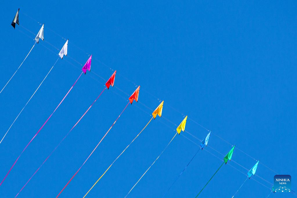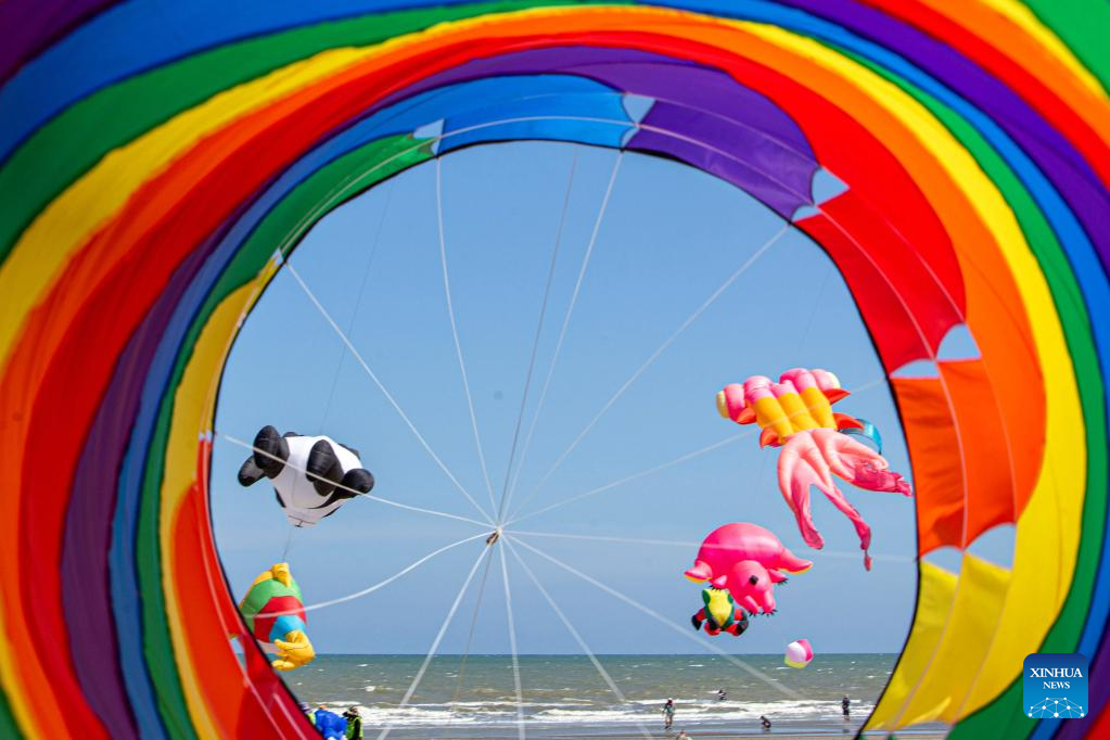 Kites hover above the Cha-am Beach in Phetchaburi, Thailand, on April 23, 2022. Kite enthusiasts and visitors gathered on Saturday at Cha-am Beach in Thailand's southern Phetchaburi province to enjoy the annual international kite festival. (Xinhua/Wang Teng)