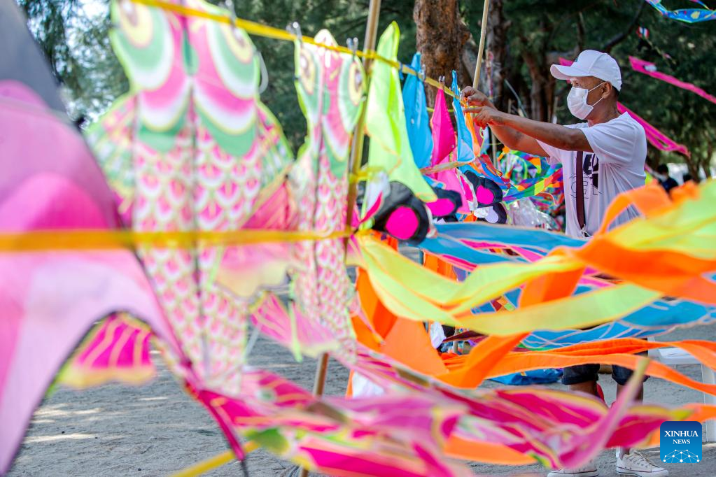 A vendor sells kites at the Cha-am Beach in Phetchaburi, Thailand, on April 23, 2022. Kite enthusiasts and visitors gathered on Saturday at Cha-am Beach in Thailand's southern Phetchaburi province to enjoy the annual international kite festival. (Xinhua/Wang Teng)