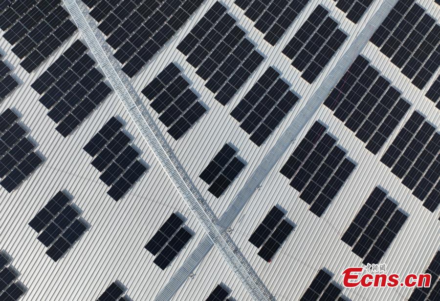 Aerial photo of photovoltaic modules on the roof of Hangzhou West Railway Station, Hangzhou, east China's Zhejiang Province, April 24, 2022. (Photo: China News Service/Wang Gang)