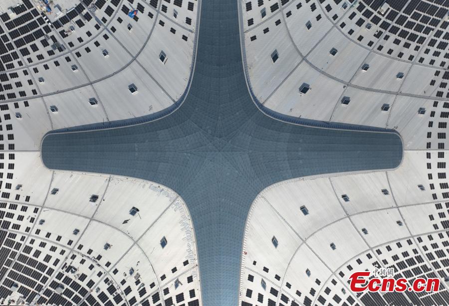 Aerial photo of photovoltaic modules on the roof of Hangzhou West Railway Station, Hangzhou, east China's Zhejiang Province, April 24, 2022. (Photo: China News Service/Wang Gang)