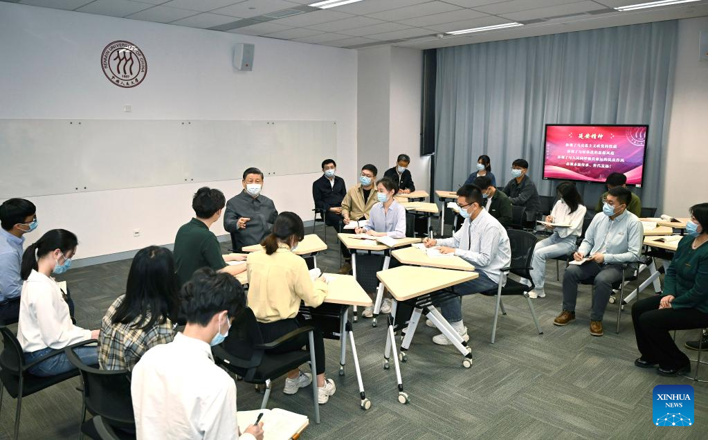 Chinese President Xi Jinping, also general secretary of the Communist Party of China Central Committee and chairman of the Central Military Commission, sits with students, listening attentively and joining their discussions, at a smart classroom for ideological-political courses during a visit to Renmin University of China in Beijing, capital of China, April 25, 2022. (Xinhua/Yan Yan)