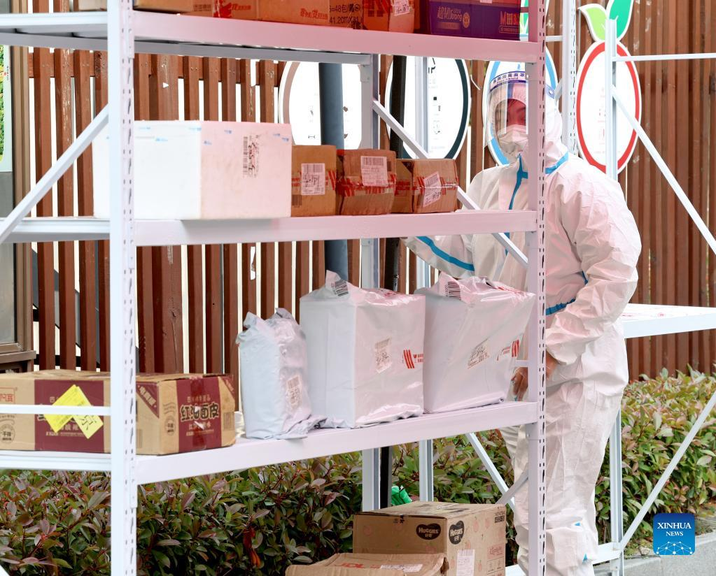 A worker arranges packages on a shelf in a community of Jiading District, east China's Shanghai, April 25, 2022. Many communities in Shanghai have been using unmanned delivery vehicles to distribute supplies to residents amid challenges caused by the recent resurgence of COVID-19. (Xinhua/Chen Jianli)