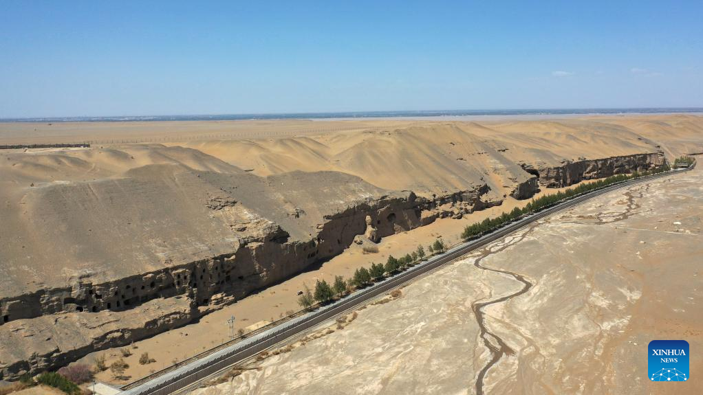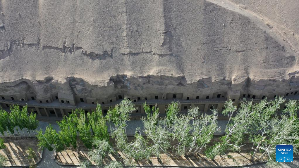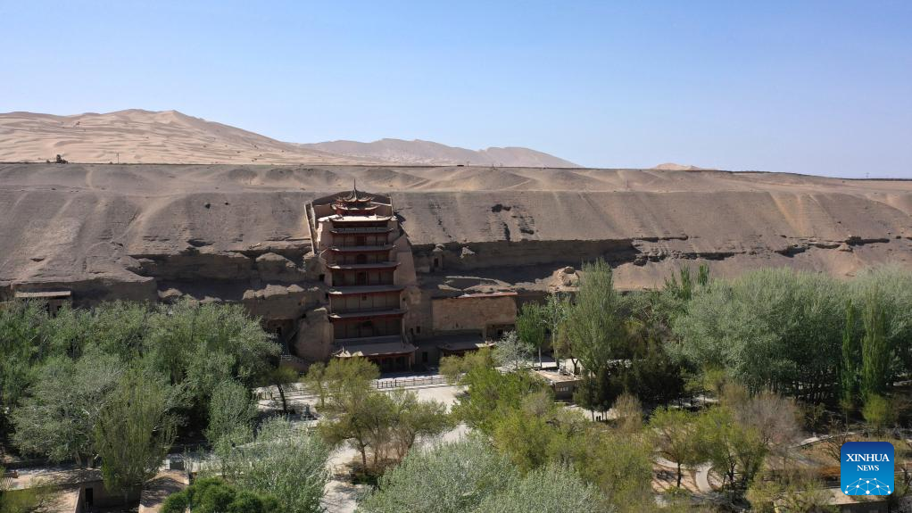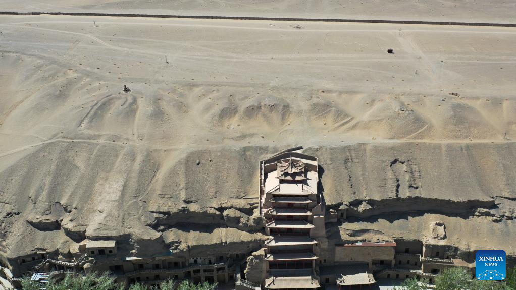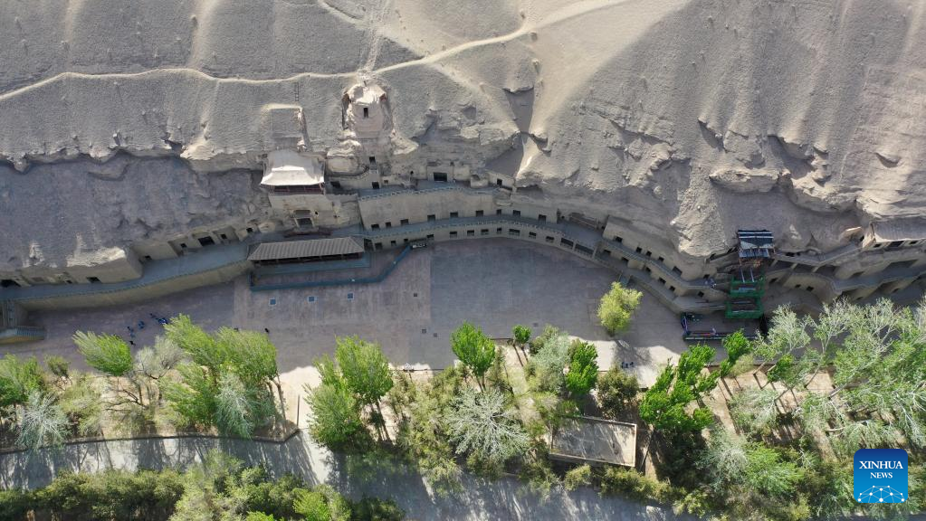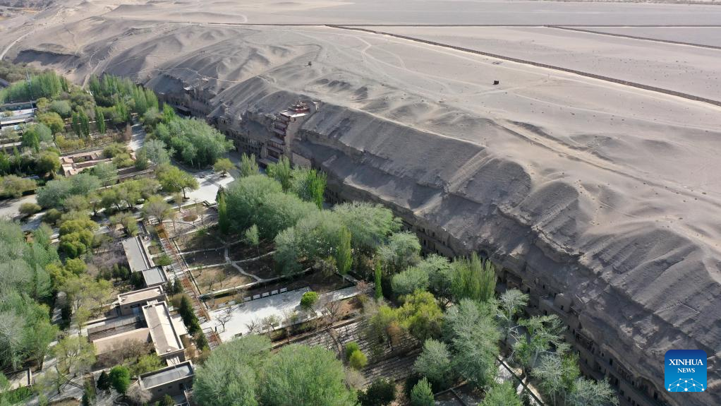 Aerial photo taken on April 19, 2022 shows the Mogao Grottoes in Dunhuang, northwest China's Gansu Province. Located in Dunhuang, northwest China's Gansu Province, the millennium-old Mogao Grottoes are home to a vast collection of Buddhist artworks which are considered the finest in existence -- more than 2,000 colored sculptures and 45,000 square meters of murals -- in 735 caves carved along a cliff by ancient worshippers.