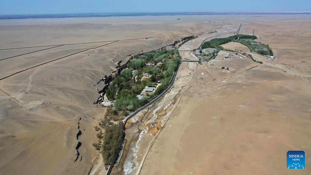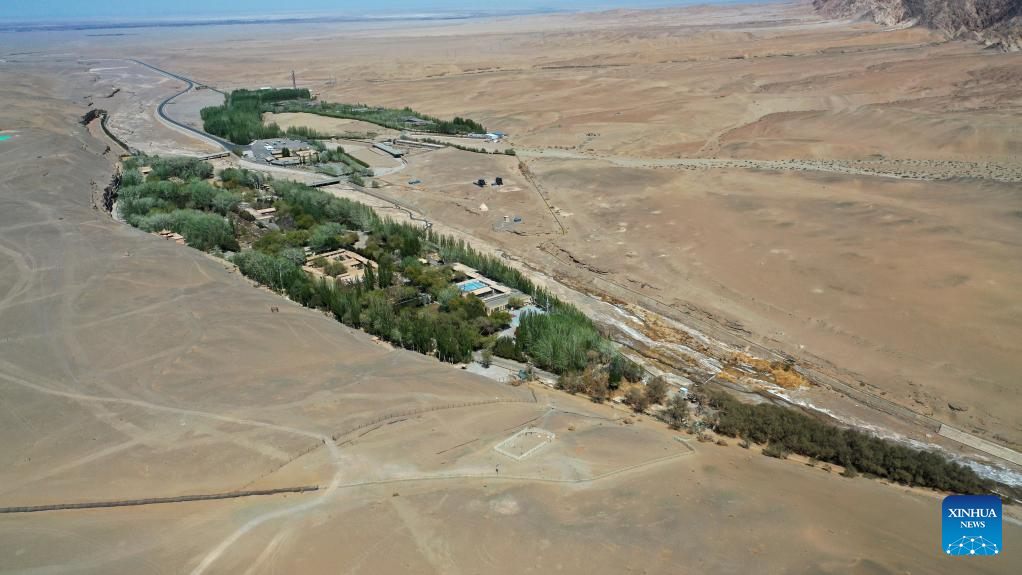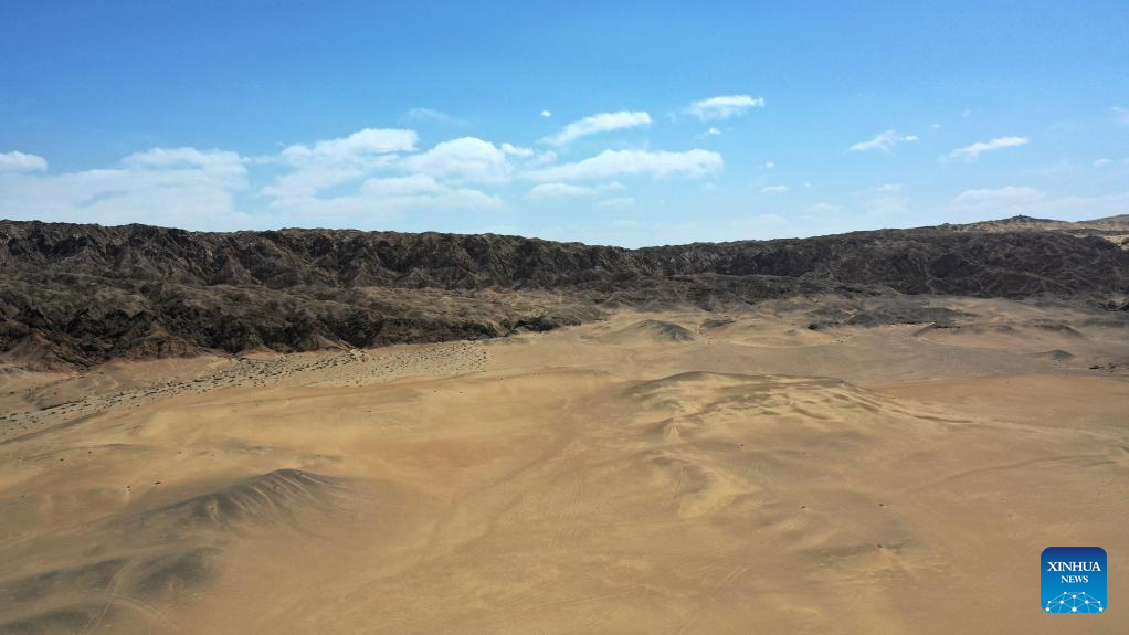 Aerial photo taken on April 18, 2022 shows the desert near the Mogao Grottoes in Dunhuang, northwest China's Gansu Province. Located in Dunhuang, northwest China's Gansu Province, the millennium-old Mogao Grottoes are home to a vast collection of Buddhist artworks which are considered the finest in existence -- more than 2,000 colored sculptures and 45,000 square meters of murals -- in 735 caves carved along a cliff by ancient worshippers.
