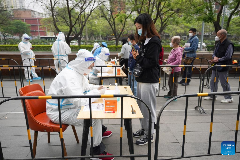 Staff members register for residents before nucleic acid test at a testing site in Chaoyang District, Beijing, capital of China, April 25, 2022. (Xinhua/Ju Huanzong)