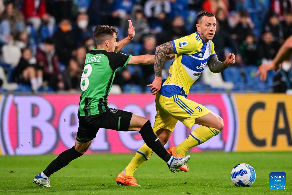 Juventus' Federico Bernardeschi (R) vies with Sassuolo's Maxime Lopez during their Serie A football match in Reggio Emilia, Italy, on April 25, 2022. (Photo by Federico Tardito/Xinhua)
