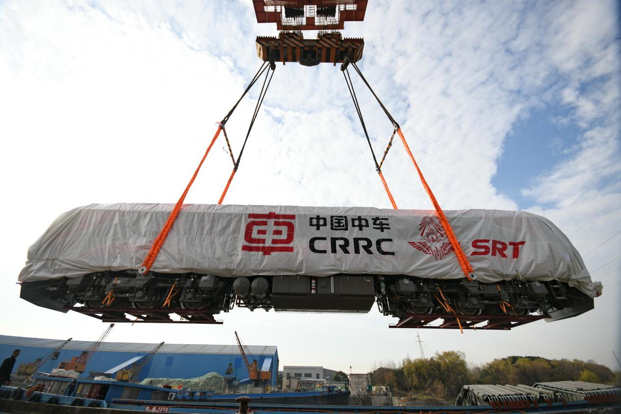 The CDA5B1 meter-gauge AC transmission diesel locomotives produced by CRRC Qishuyan Co., Ltd. for Thailand are loaded onto a ship at a wharf of Changzhou west port in Changzhou city, east China’s Jiangsu province, Dec. 20, 2021. (People’s Daily Online/Shi Kang)