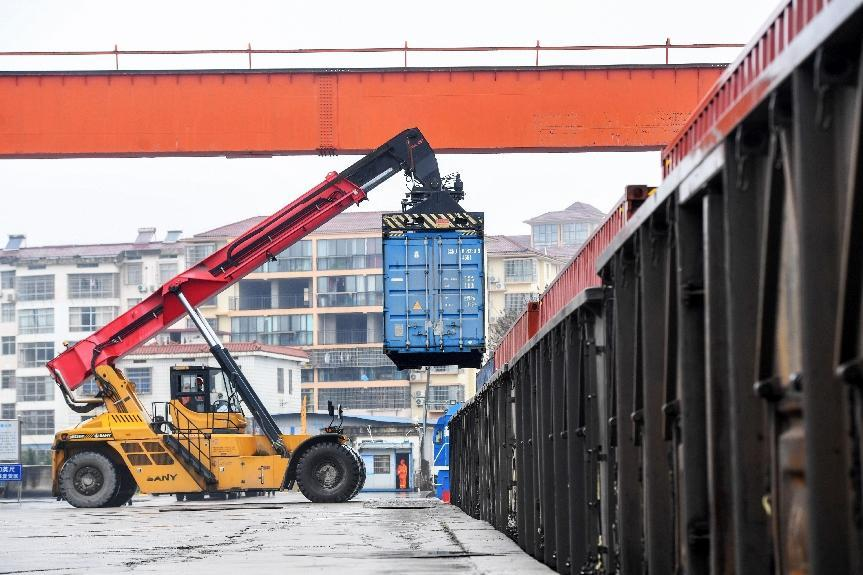 The first special train running between Yichun city, east China’s Jiangxi province, and the ASEAN countries via Ningbo city, east China’s Zhejiang province, is being loaded at the section No. 370 of the Jiangxi provincial bureau of the National Food and Strategic Reserves Administration at Yichunxi Railway Station, Jan. 27, 2022. (People’s Daily Online/Zhou Liang)