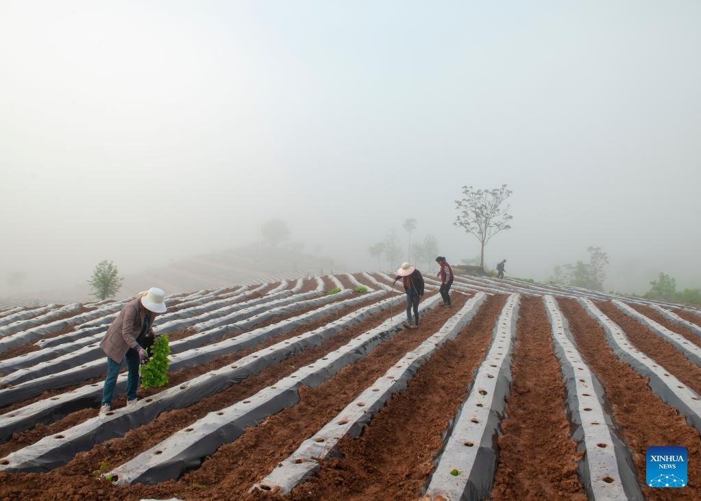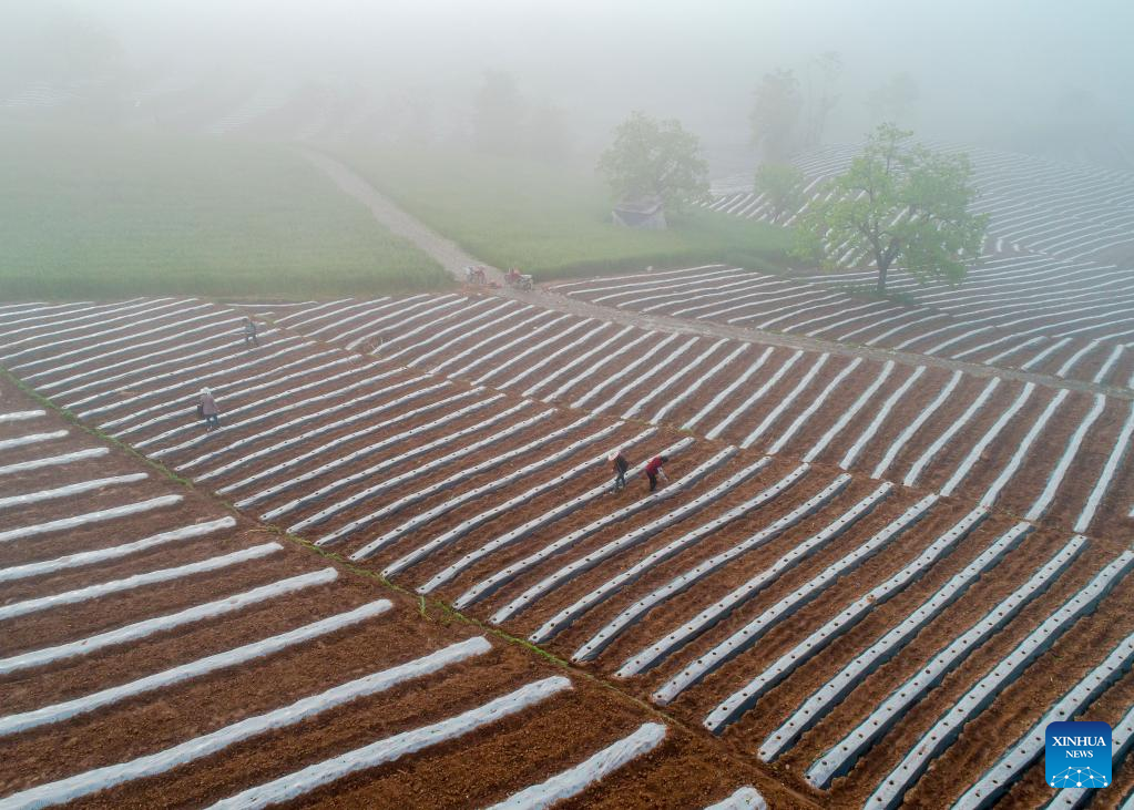 Farmers work in terraced fields in Tanjiazhuang Village of Lueyang County in Hanzhong, northwest China's Shaanxi Province, April 26, 2022. (Photo by Liu Xinhua/Xinhua)