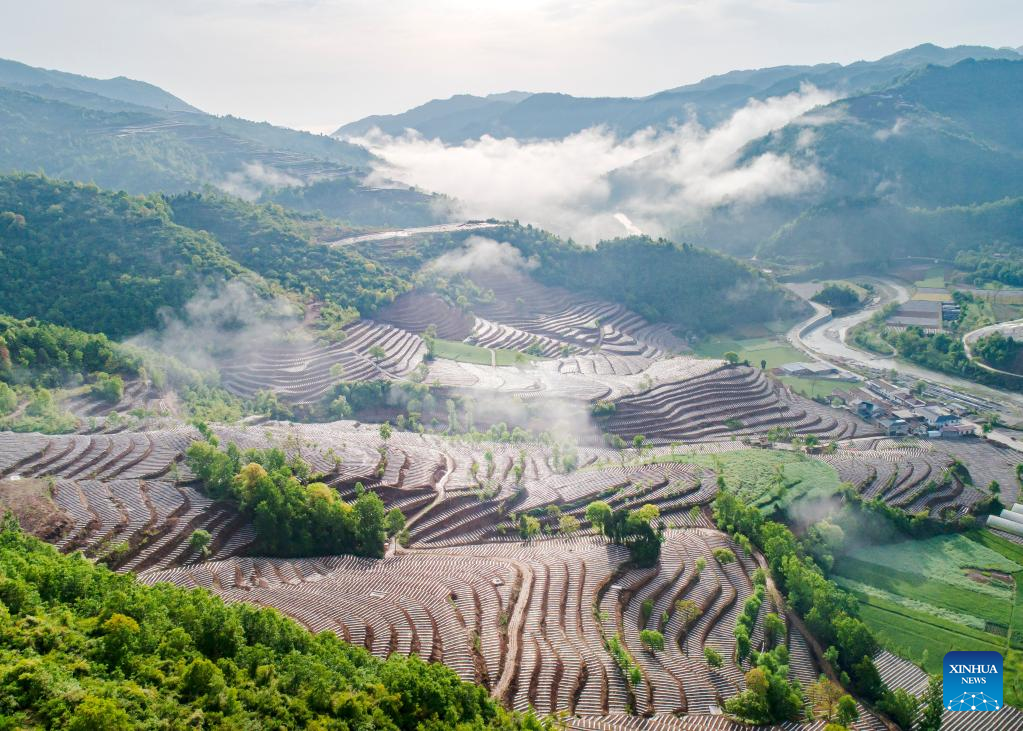 Aerial photo taken on April 26, 2022 shows terraced fields in Tanjiazhuang Village of Lueyang County in Hanzhong, northwest China's Shaanxi Province. (Photo by Liu Xinhua/Xinhua)