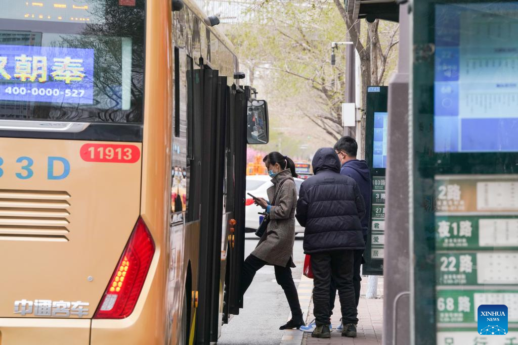 Citizens get on a bus in Harbin, northeast China's Heilongjiang Province, April 26, 2022. Harbin has updated its epidemic control and prevention measures from April 26 to 29 in six districts including Daoli, Daowai, Nangang, Xiangfang, Pingfang and Songbei, according to local authority.