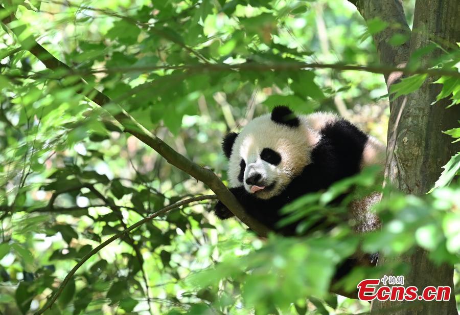 A giant panda cub rests in a tree at Dujiangyan Base of China Conservation and Research Center for Giant Pandas, Chengdu, southwest China's Sichuan Province, April 26, 2022. (Photo: China News Service/An Yuan)