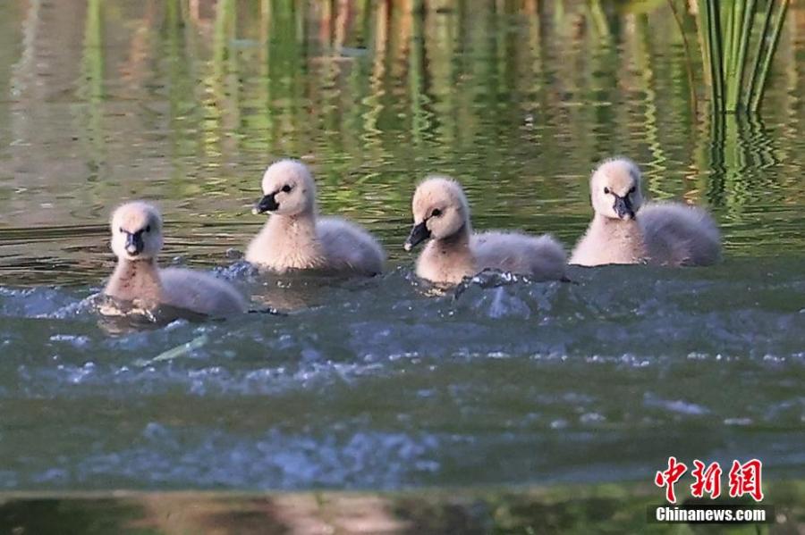 Four black swan babies swim in the Yanque Lake in Nanjing, east China's Jiangsu Province, April 26, 2022. (Photo: China News Service/Yang Bo)