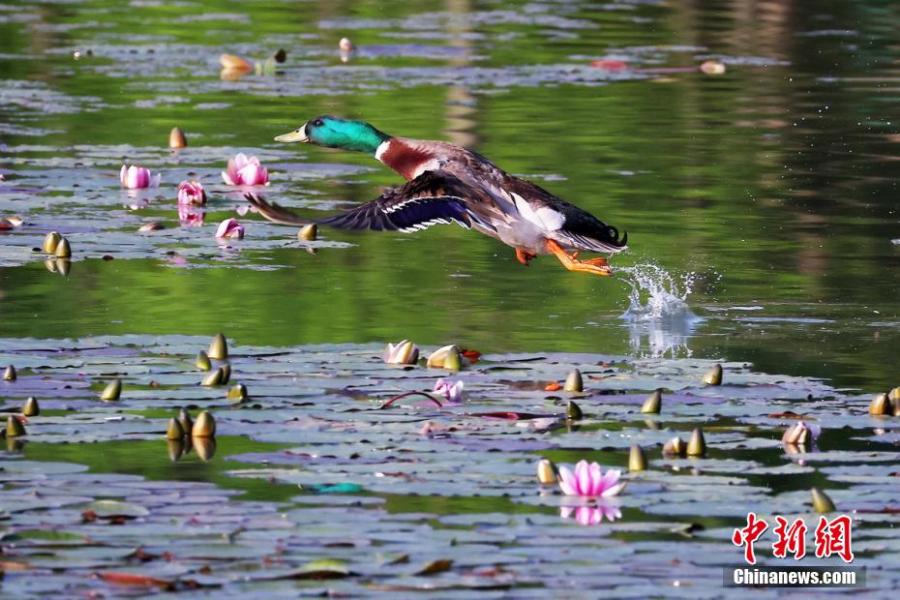 A wild duck flies over the Yanque Lake in Nanjing, east China's Jiangsu Province, April 26, 2022. (Photo: China News Service/Yang Bo)
