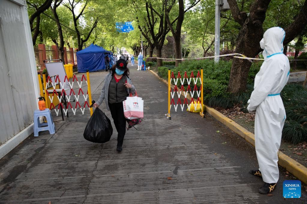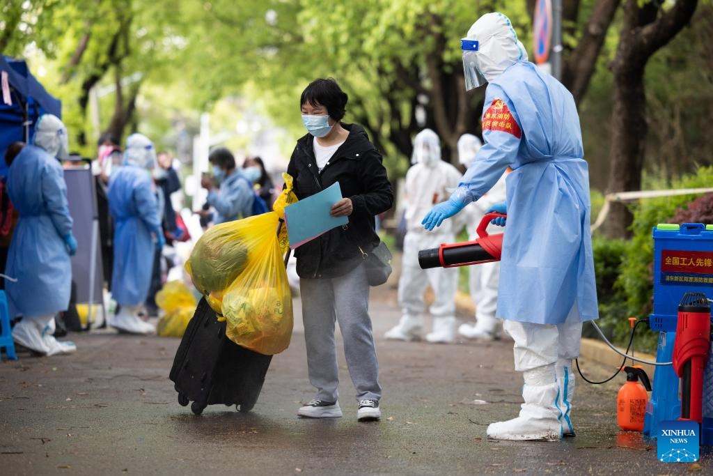 A villager carrying baggage returns to Lianqin Village of Beicai Town in Pudong New Area, east China's Shanghai, April 26, 2022.