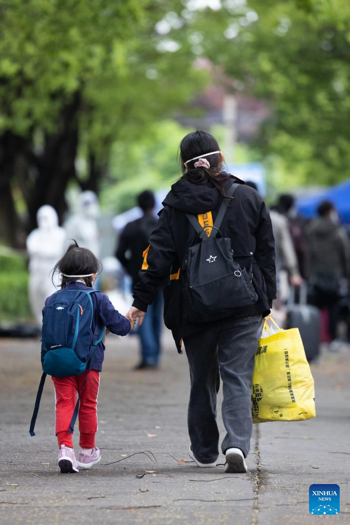 A mother and her daughter return to Lianqin Village of Beicai Town in Pudong New Area, east China's Shanghai, April 26, 2022.