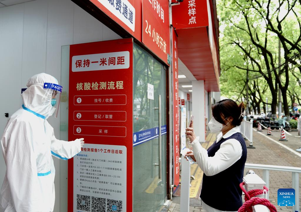 Photo taken on April 27, 2022 shows a nucleic acid testing site in Minhang District, east China's Shanghai. Shanghai has announced the first batch of 534 sites for regular nucleic acid testing on Tuesday, as an effort to boost citizens' access to nucleic acid testing. (Xinhua/Zhang Jiansong)