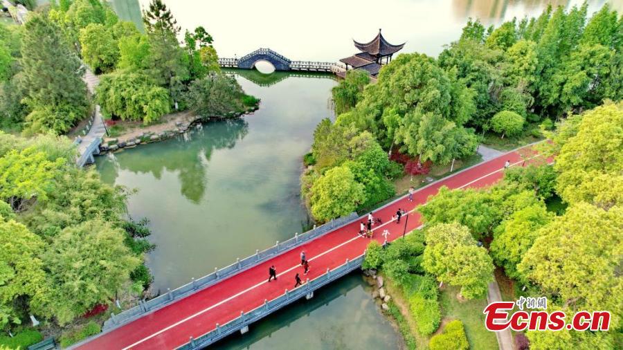 People exercise on the newly-built trail at Zhangjiang National Wetland Park, Ganzhou, east China's Jiangxi Province. Colored trail winding along the lakeshore looks like a red ribbon at the park. (Photo: China News Service/Zhu Haipeng)
