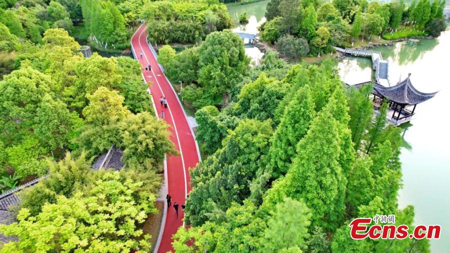 People exercise on the newly-built trail at Zhangjiang National Wetland Park, Ganzhou, east China's Jiangxi Province. Colored trail winding along the lakeshore looks like a red ribbon at the park. (Photo: China News Service/Zhu Haipeng)