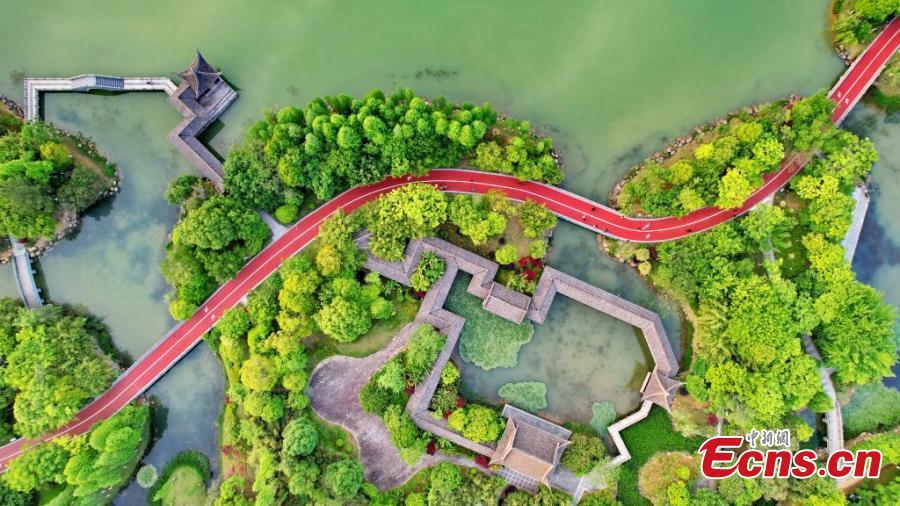 People exercise on the newly-built trail at Zhangjiang National Wetland Park, Ganzhou, east China's Jiangxi Province. Colored trail winding along the lakeshore looks like a red ribbon at the park. (Photo: China News Service/Zhu Haipeng)