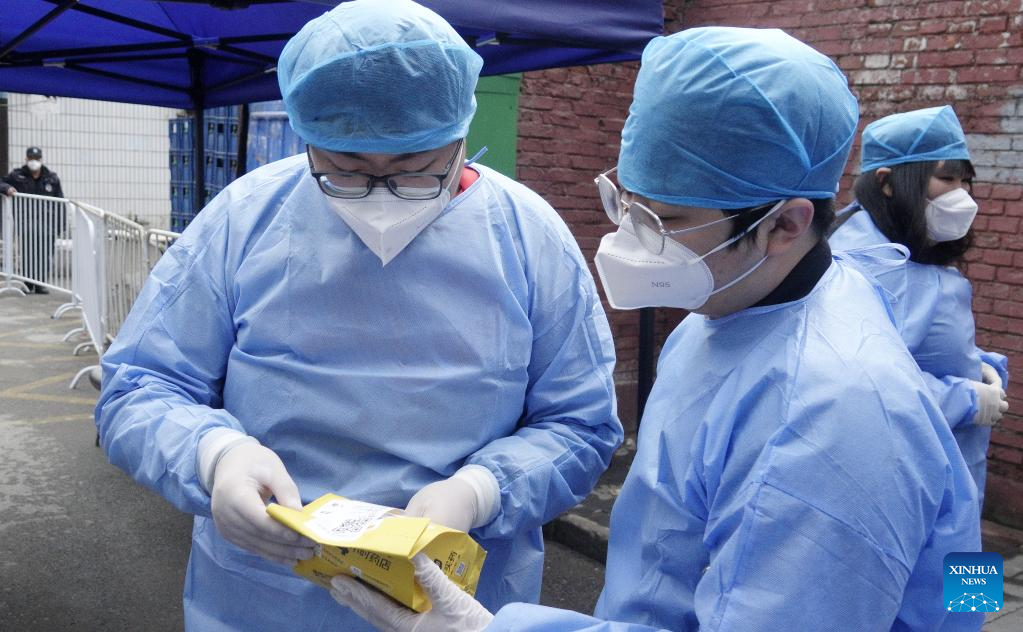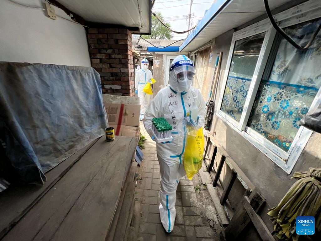 Medical workers go door-to-door to take swab samples for nucleic acid testing in Xicheng District of Beijing, capital of China, April 24, 2022.