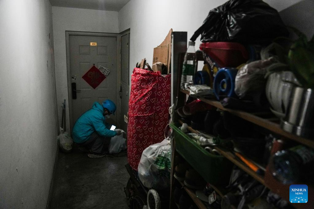 A delivery man delivers parcels to the doorstep of households in a community in Chaoyang District of Beijing, capital of China, April 28, 2022.