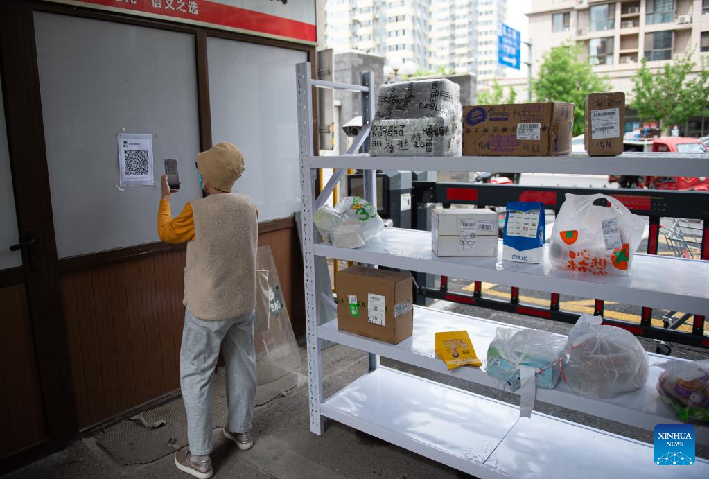 A resident picks a parcel with the help of a community worker in a community in Dongcheng District of Beijing, capital of China, April 28, 2022.
