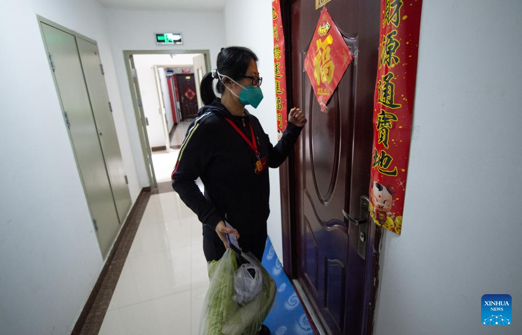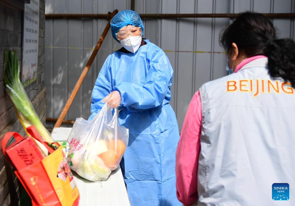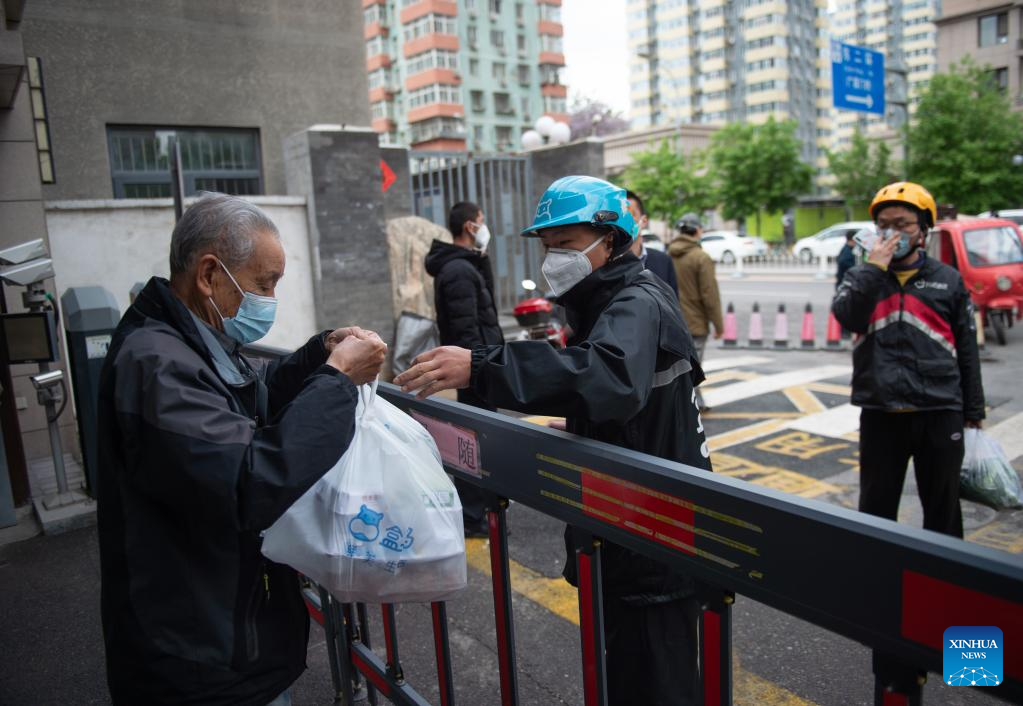 A community worker delivers daily necessities to residents in a community in Xicheng District of Beijing, capital of China, April 24, 2022.