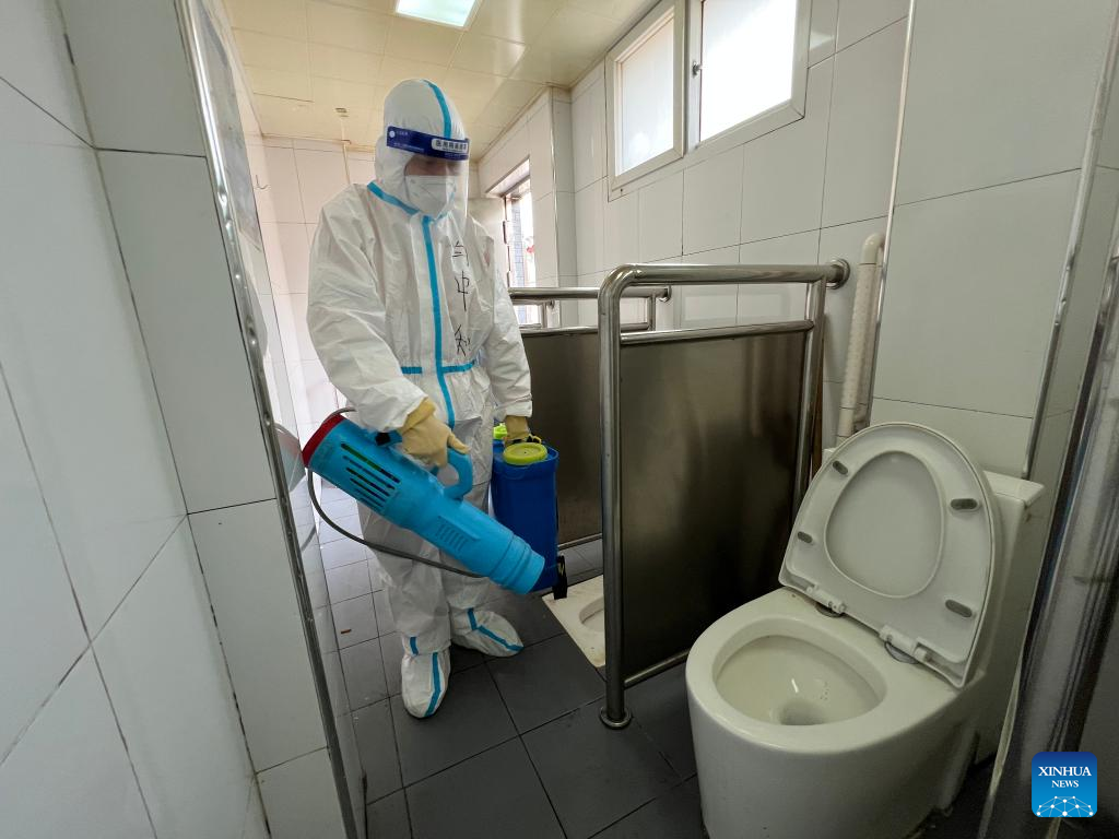 A staff member disinfects a public toilet in Xicheng District of Beijing, capital of China, April 24, 2022.