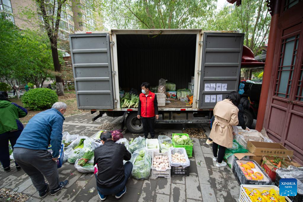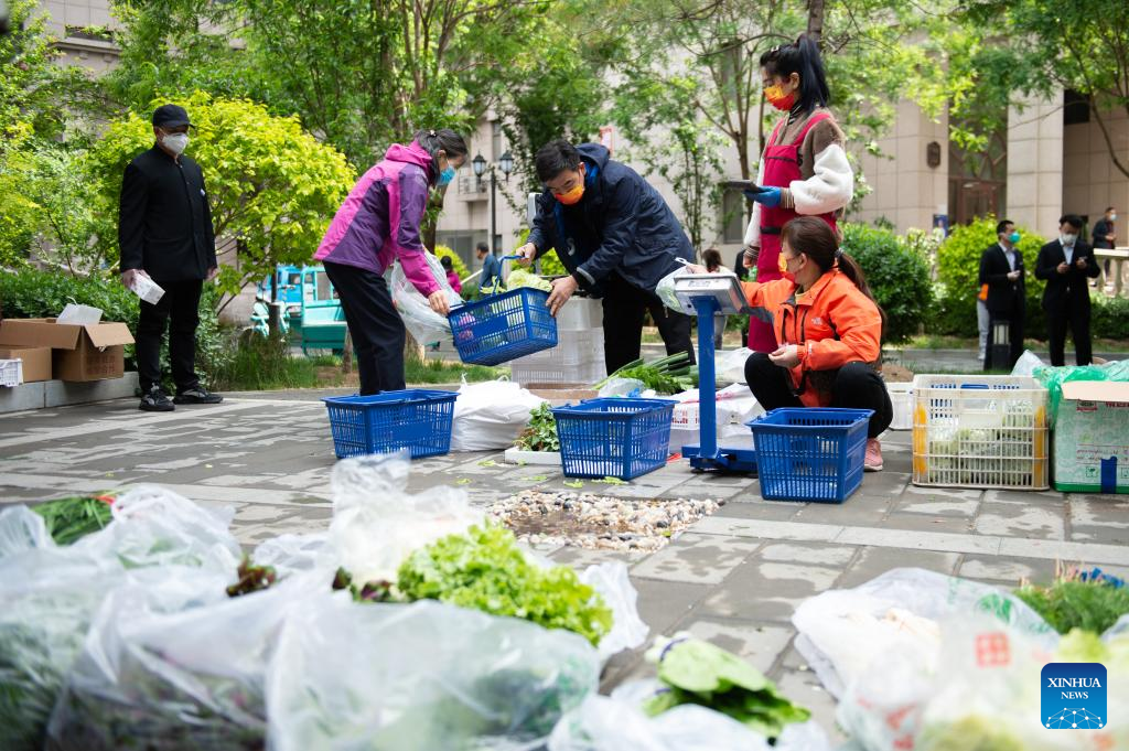 A resident (2nd L) buys vegetables at a temporary stand selling daily necessities in a community in Chaoyang District of Beijing, capital of China, April 28, 2022.