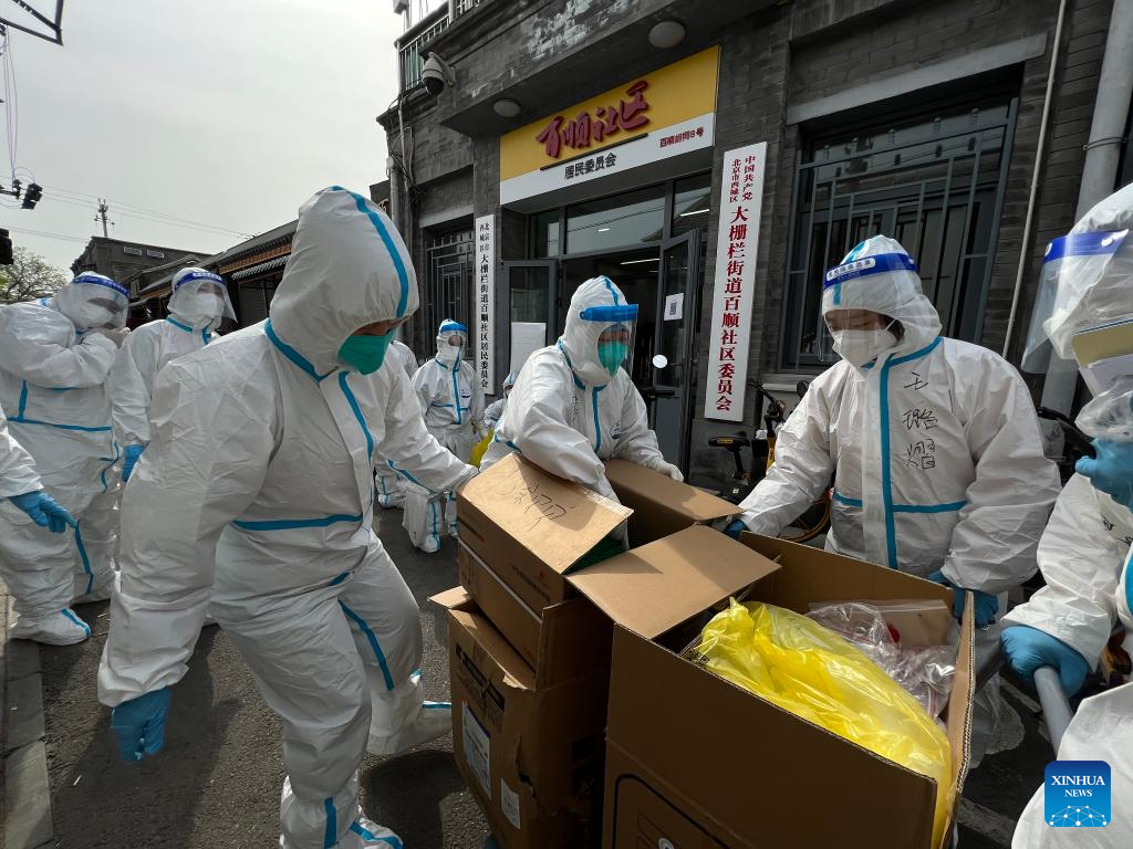 Community workers transport medical supplies in Xicheng District of Beijing, capital of China, April 24, 2022.