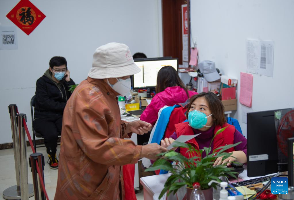 A staffer of a neighborhood committee (R, front) provides service for a senior who needs medical help in Chaoyang District of Beijing, capital of China, April 28, 2022.