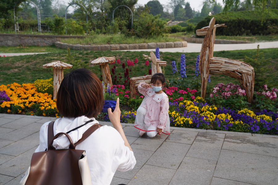 A child poses for photos in front of flowers at China's National Botanical Garden in Beijing, capital of China on April 25, 2022. (People's Daily Online/Zhang Wenjie)