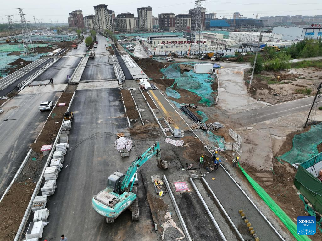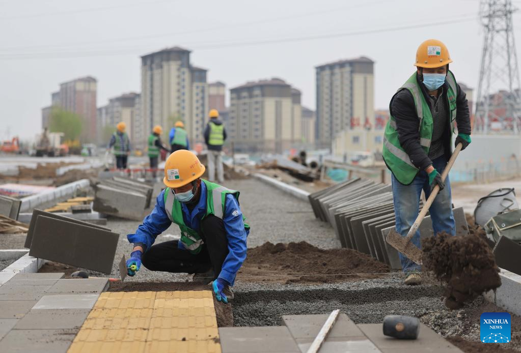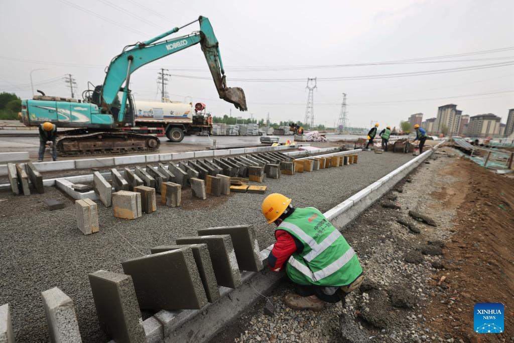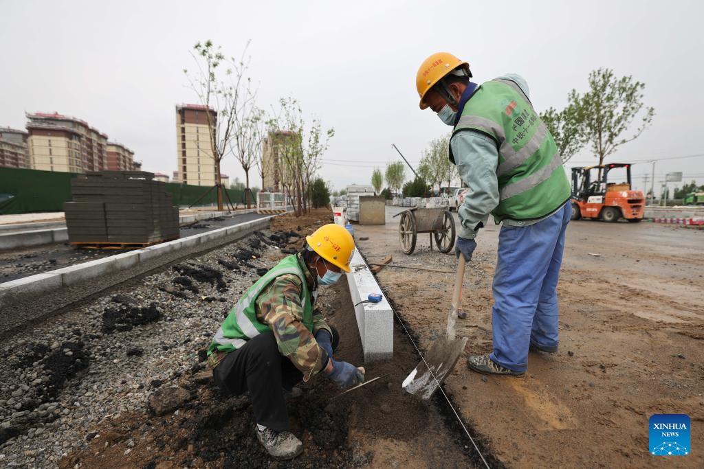 Workers work at the construction site of Aowei street in Xiong'an New Area, north China's Hebei Province, April 28, 2022. Aowei street is a main street going from the east to the west in Xiong'an New Area. The project will be completed soon. (Xinhua/Xing Guangli)