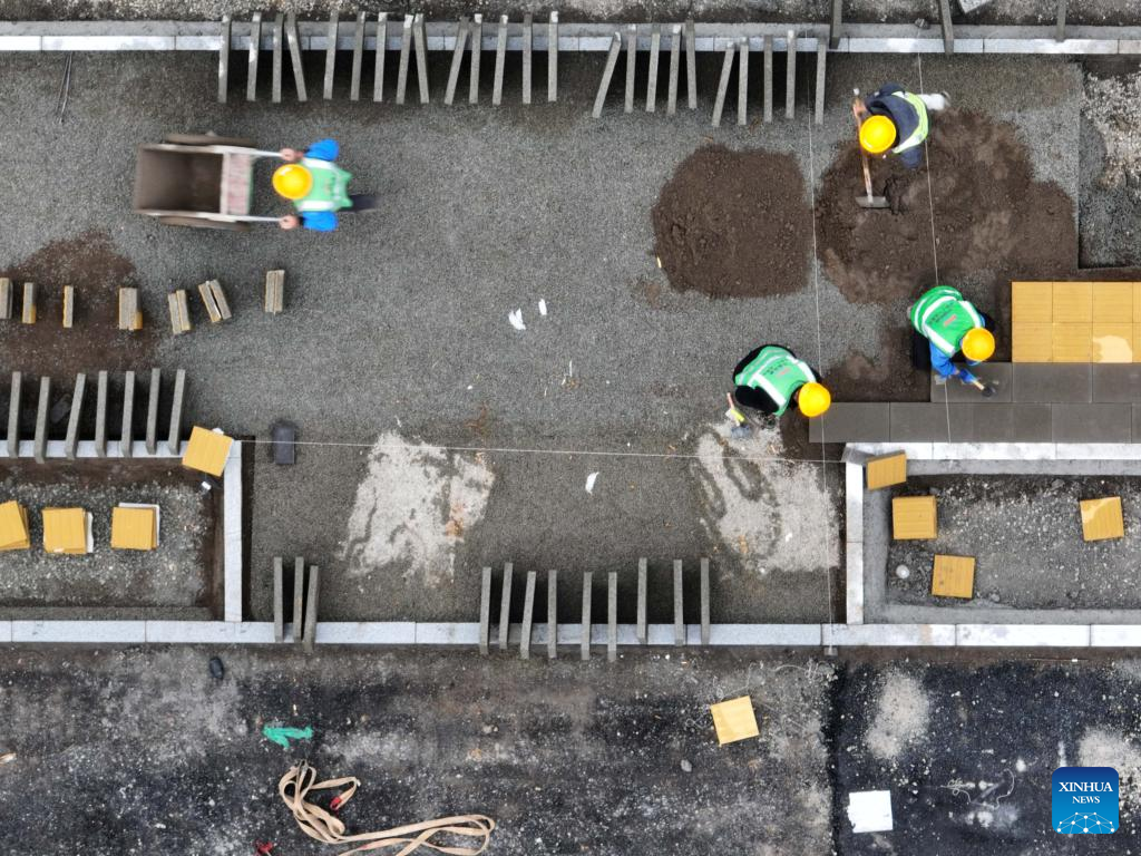 Aerial photo taken on April 28, 2022 shows workers working at the construction site of Aowei street in Xiong'an New Area, north China's Hebei Province. Aowei street is a main street going from the east to the west in Xiong'an New Area. The project will be completed soon. (Xinhua/Xing Guangli)