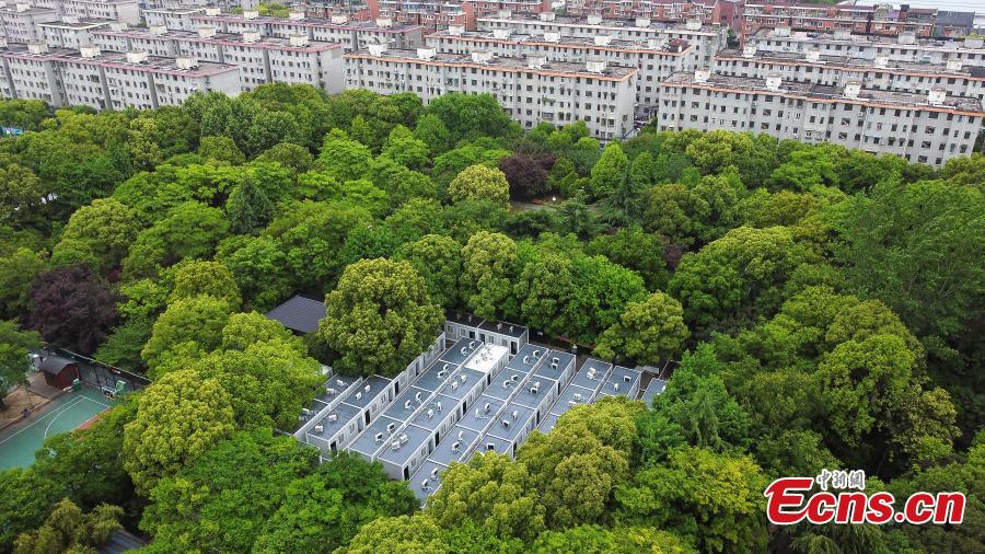 Aerial photo shows a quarantine sites under construction at Sitang basketball park, east China's Shanghai, April 28, 2022. Shanghai will set up more quarantine sites to fight the COVID-19 resurgence. (Photo: China News Service/Yin Liqun)