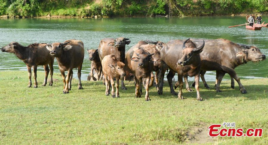 Spectacular view of a herd of buffaloes crossing the Jialing River to forage on Taiyang island, Peng'an county, southwest China's Sichuan Province, April 29, 2022. (Photo: China News Service/Liu Yonghong)