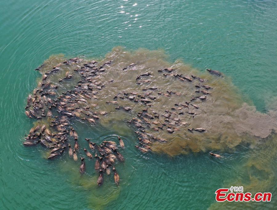 Buffalo herd swims across Jialing River to forage in Sichuan