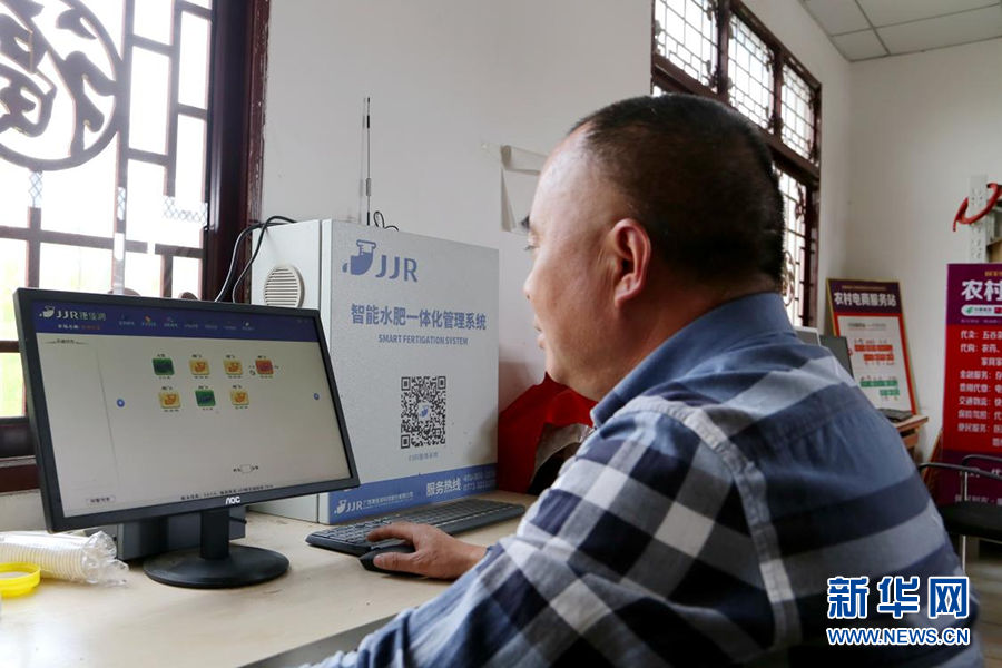Luo Hongwei, head of an ecological farming company in Guizhou, remotely checks the growth of kiwifruits at a planting base run by his company, via a smart farming system. (Photo/Xinhua)