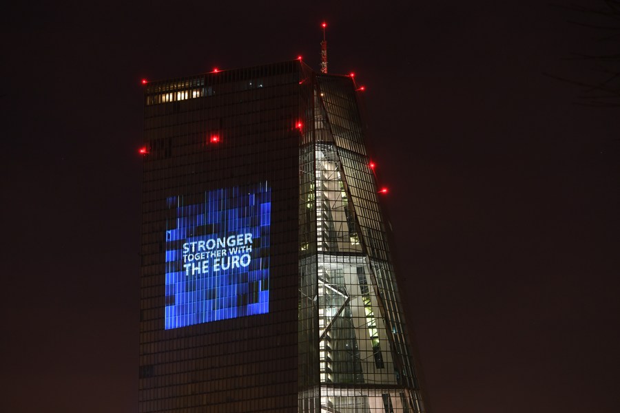 Photo taken on Jan. 1, 2022 shows the headquarters of the European Central Bank illuminated to celebrate the 20th anniversary of Euro banknotes and coins in Frankfurt, Germany. (Xinhua/Lu Yang)