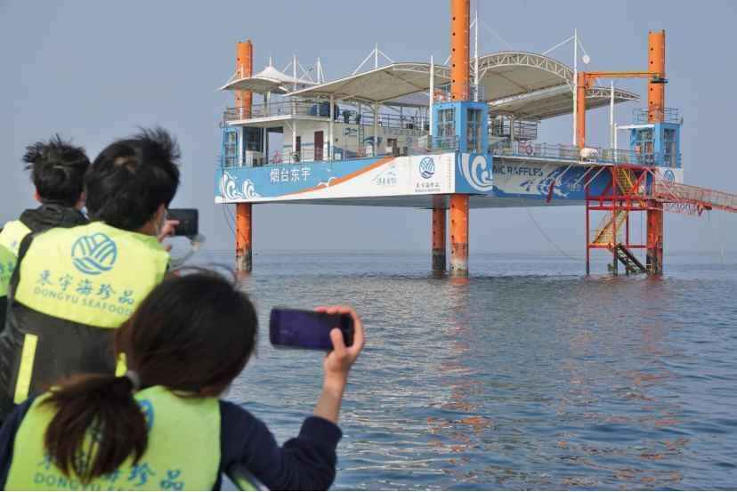 Tourists are on a trip to a self-elevating marine ranching complex in Yantai, east China's Shandong province, April 19, 2022. (People's Daily Online/Tang Ke)