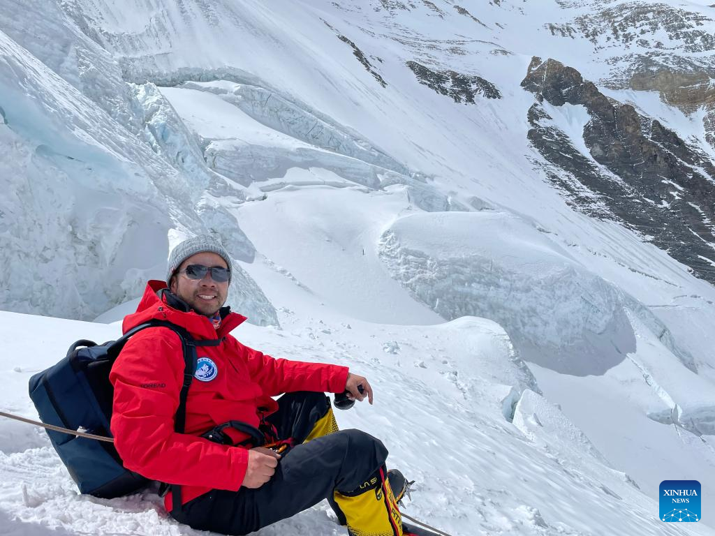 Zhao Huabiao, a researcher with the Institute of Tibetan Plateau Research (ITP), Chinese Academy of Sciences, is seen on his way to set up an automatic weather station on Mount Qomolangma, April 28, 2022.(Xinhua)