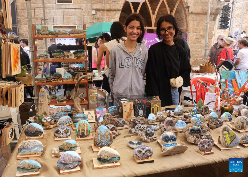A stone painting stand is seen at a spring fair in Batroun, northern Lebanon, on April 30, 2022. (Xinhua/Liu Zongya)